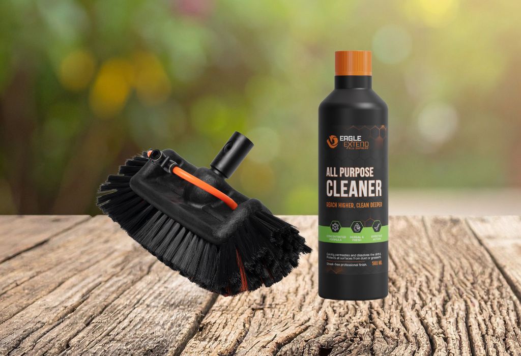 Voor rolluiken is een standaard borstel vaak niet voldoende. Eagle Extend adviseert de Vijfvlaksborstel. Deze borstel heeft haren aan de zijkanten, waardoor u niet alleen het vlakke deel poetst, maar tegelijkertijd de diepe richels van de lamellen en de hoeken van de kozijnen meeneemt zonder het kunststof te krassen.