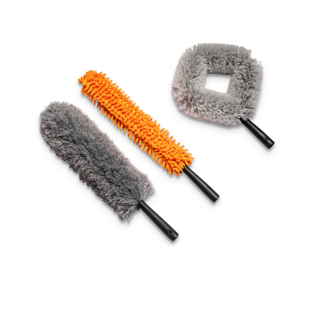 Bevestig de ragebol voor spinnenwebben of de plumeau voor fijnstof stevig op de telescoopsteel. Zorg dat de hoekadapter (indien nodig) in de juiste stand staat om bijvoorbeeld bovenop een kabelgoot of lamp te komen. Alledrie de interieur borstels zijn ook buigbaar om in de moeilijke hoekjes te komen.